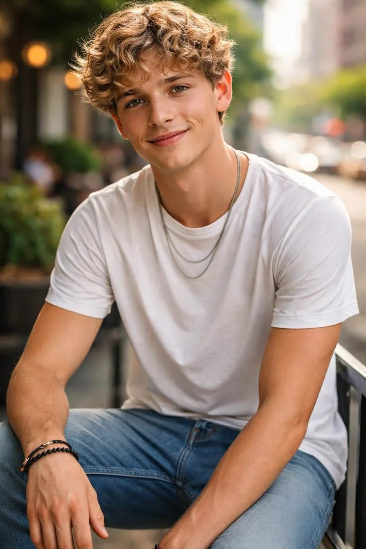 Cheveux blonds ou châtains, sans tatouages visibles ni barbe.
